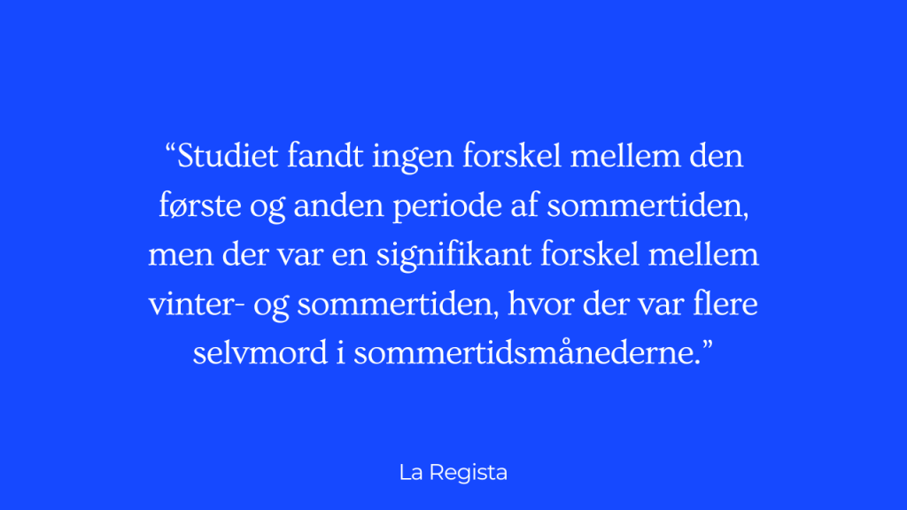 I det tredje og sidste studie om sommertid var formålet at fastslå, om der var en statistisk signifikant forskel mellem antallet af selvmord begået i de første fire måneder af sommertiden (marts-juni), de sidste fire måneder af sommertiden (juli-oktober) og de fire måneder uden sommertid (november-februar) i USA. (Kilde) Studiet fandt ingen forskel mellem den første og anden periode af sommertiden, men der var en signifikant forskel mellem vinter- og sommertiden, hvor der var flere selvmord i sommertidsmånederne. Data blev indsamlet fra 2000 til 2017 og tallene var opgjort for måneder og år og derfor ikke muligt at se på forskelle i ugen efter at der blev skiftet til sommer- og vintertid. Igen er det rigtig interessant, at der ikke kun er en forskel i ugen efter vi stiller på urene, men i hele perioden hvor vi er på sommetid, og fortæller hvor fint følsomme vi er, når vi ikke forholder os til vores eksterne omgivelser.